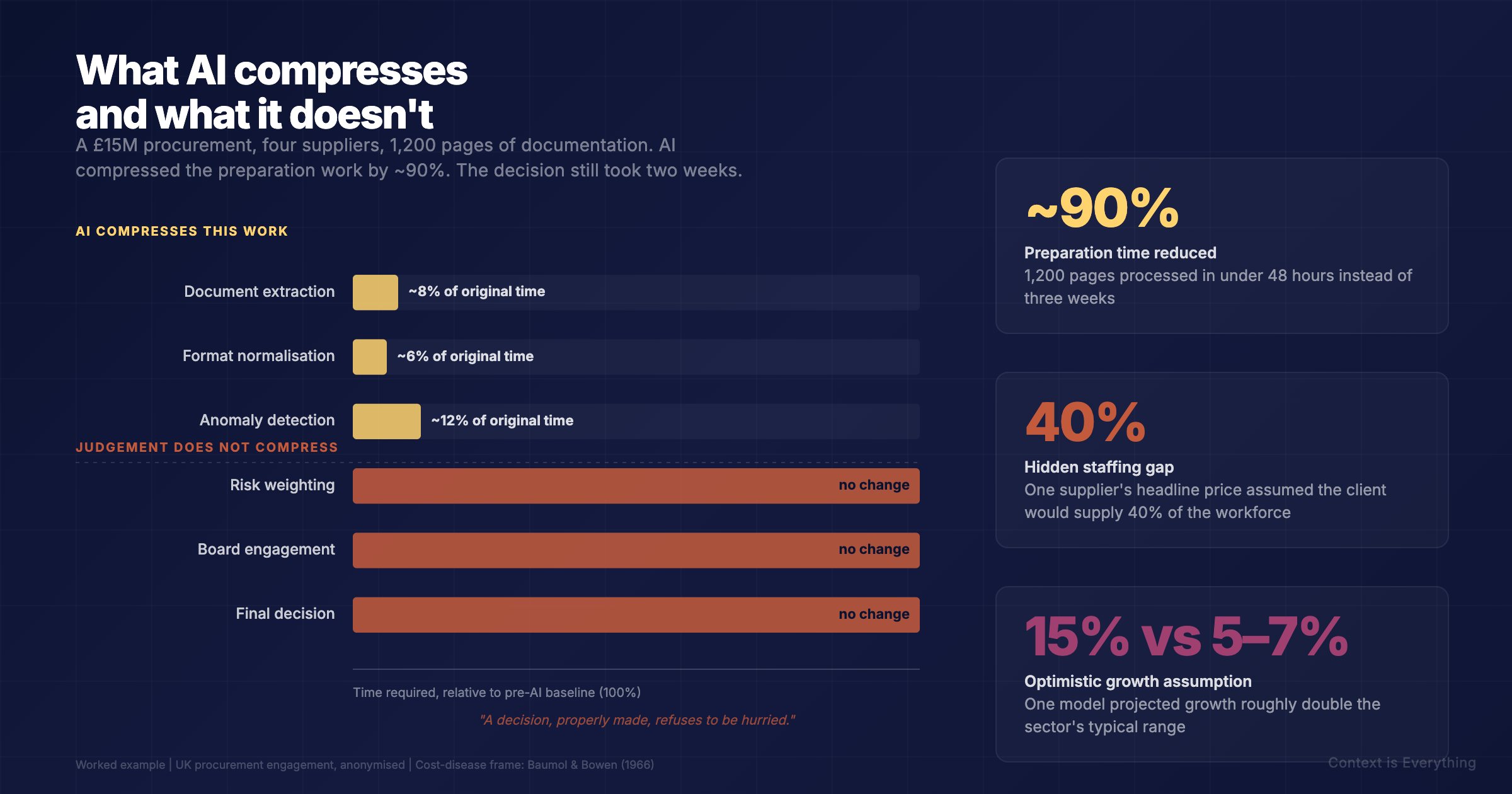 Mozart's string quartet still takes twenty-five minutes. A finance director's judgement still cannot be hurried. But everything around the decision can be compressed. A £15M procurement, 1,200 pages of supplier documentation, and what context-first AI actually surfaces.