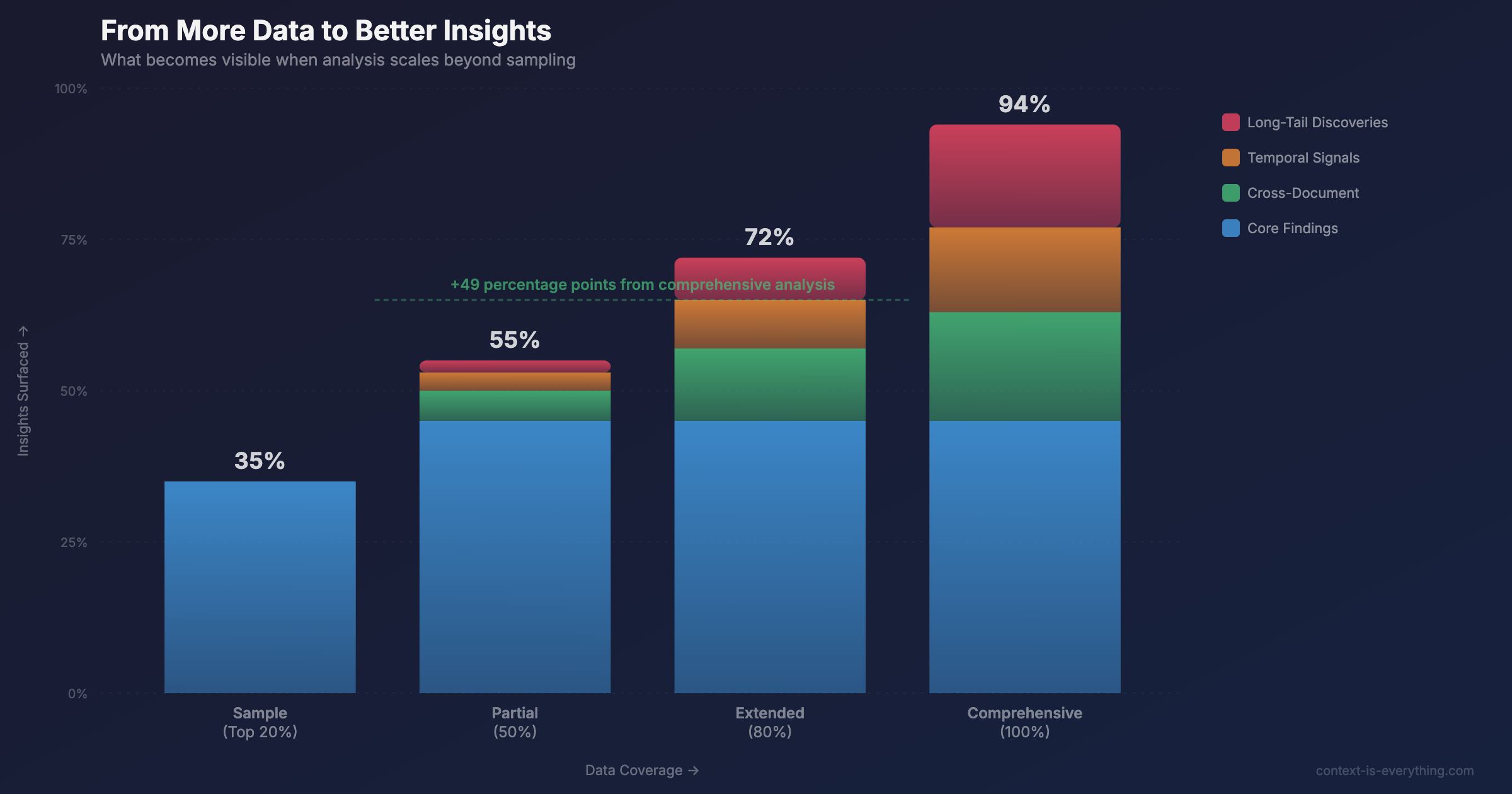 Traditional analysis is a sampling exercise disguised as comprehensive review. AI changes that equation.