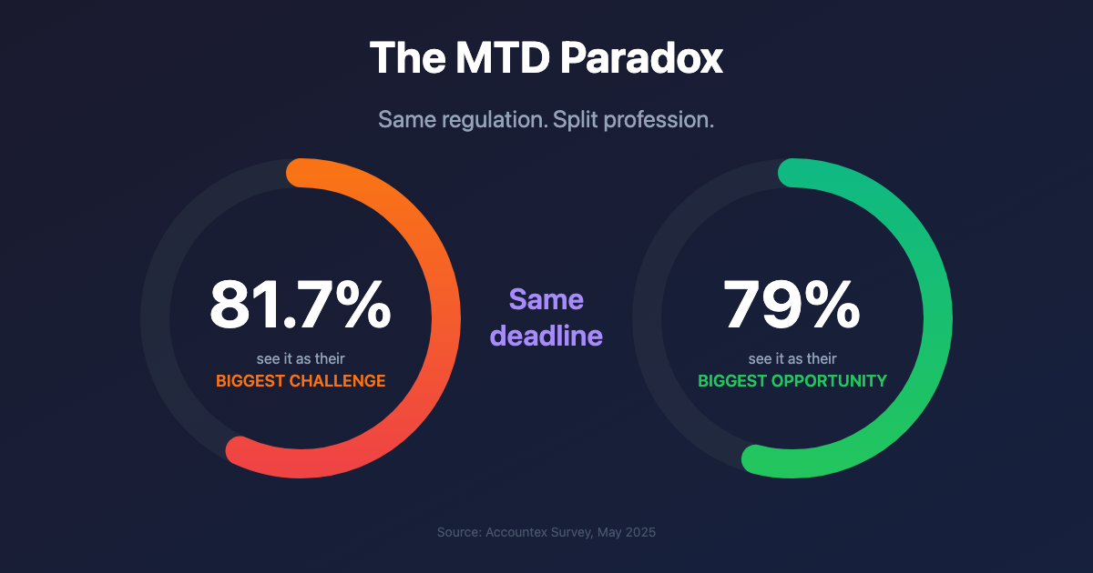 An Accountex survey (May 2025) found that 81.7% of accountants see Making Tax Digital as their biggest challenge — but 79% also see it as their biggest opportunity. That's a striking split. Same deadline, same regulation, and the profession is almost evenly divided between anxiety and ambition.