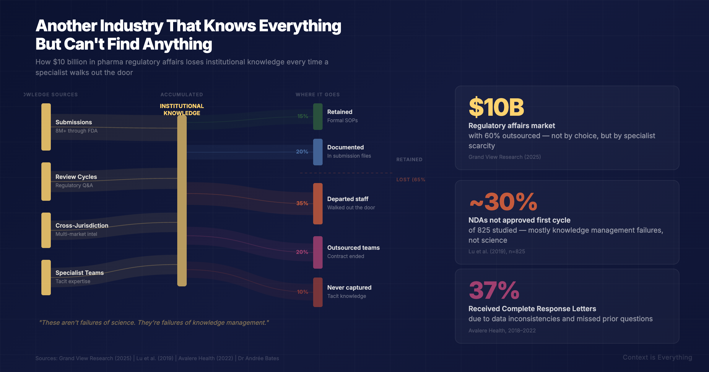 Pharmaceutical regulatory affairs is a $10 billion industry that can map a human genome in hours but still assembles regulatory submissions largely by hand. Nearly 30% of New Drug Applications aren't approved first time — not because of bad science, but because institutional knowledge walks out the door when people move on.