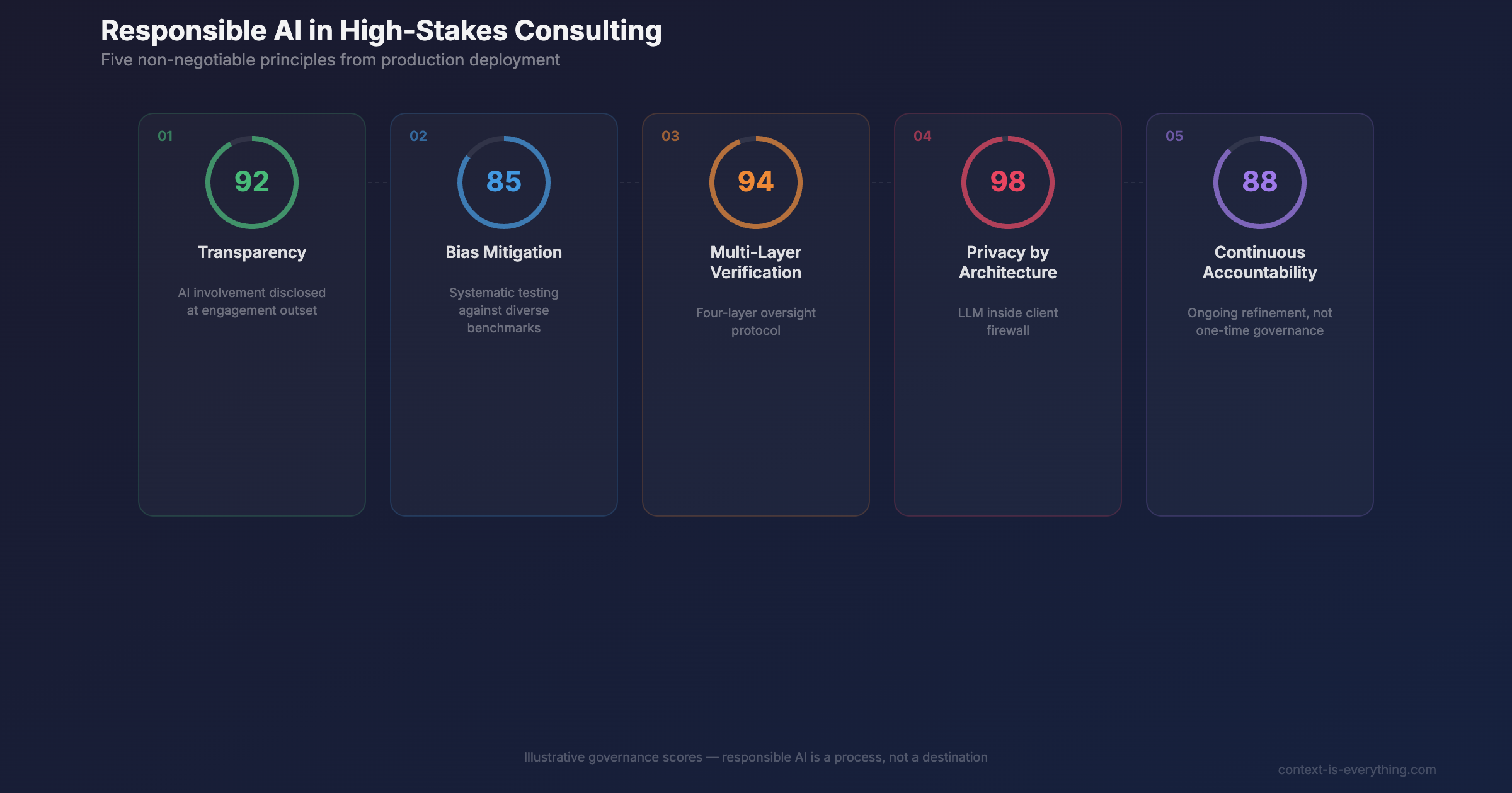 Using AI in high-stakes consulting is ethically different from using it to recommend products. When decisions affect careers, organisations, and financial outcomes, the standards must be different too. Here are five non-negotiable principles from production deployment — including what we've got wrong.