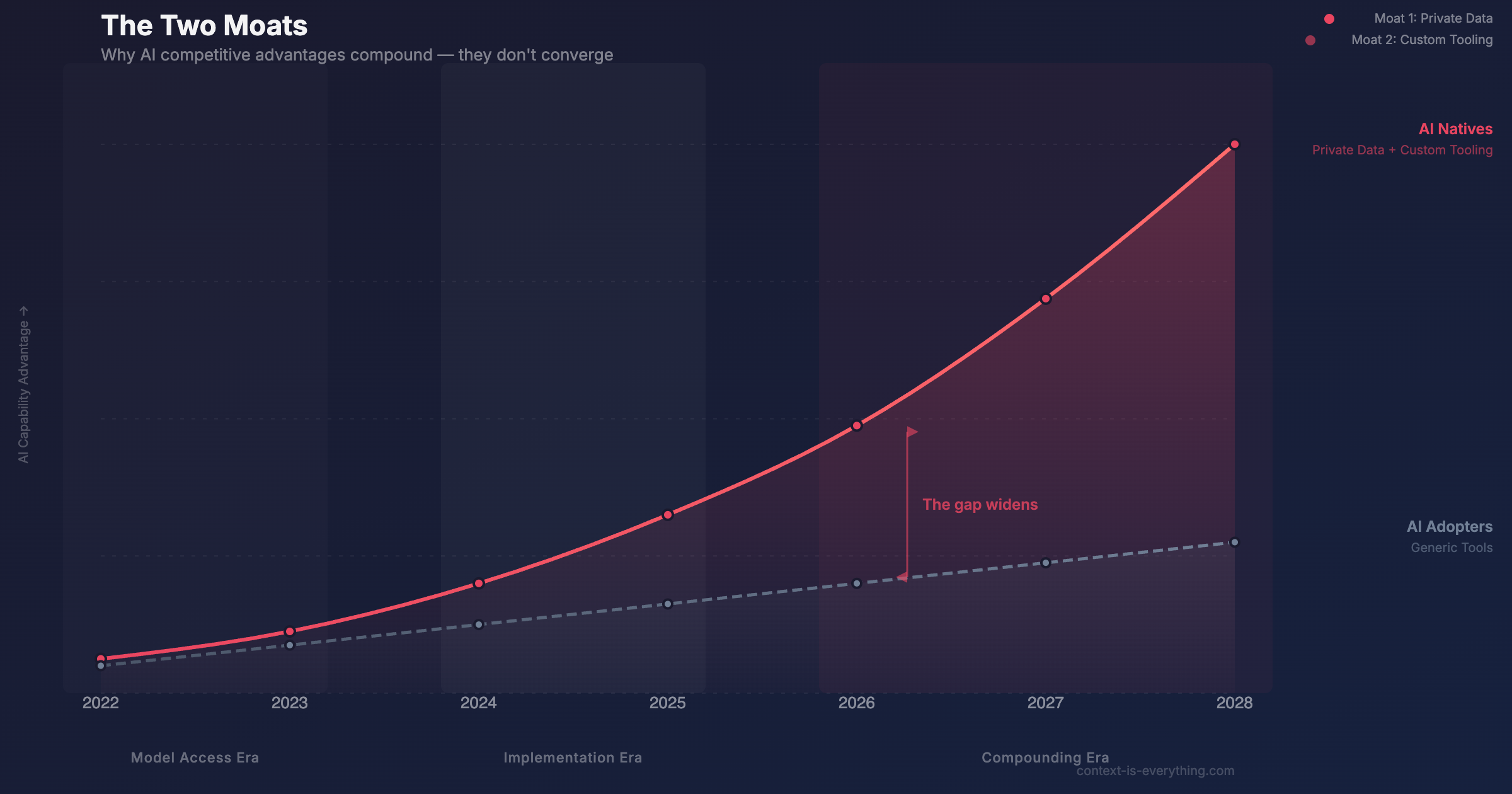 This is the opposite of what most people assume. The concern is usually: "Won't better models level the playing field?" The reality: better models make private data more valuable, because there's more sophisticated pattern recognition to apply to it. Better models make custom tooling more valuable, because there are more capabilities to optimise for.